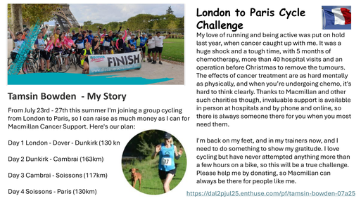 This summer, our lovely French Teacher, Miss Bowden, will be undertaking a cycle ride from London to Paris to raise money for Macmillan Cancer Support. Miss Bowden has had a demanding year, undertaking cancer treatment, and is now on the road to reco